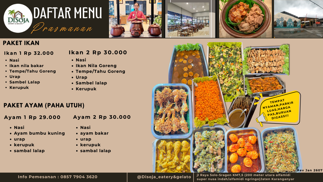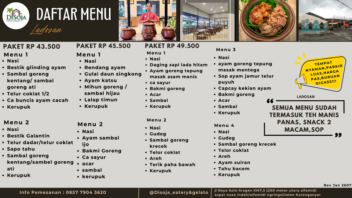 Menu makanya banyak, spesial nasi gudeg. Pelayananya ramah, tempatnya bersih ada lesehan dan ruang ac juga.