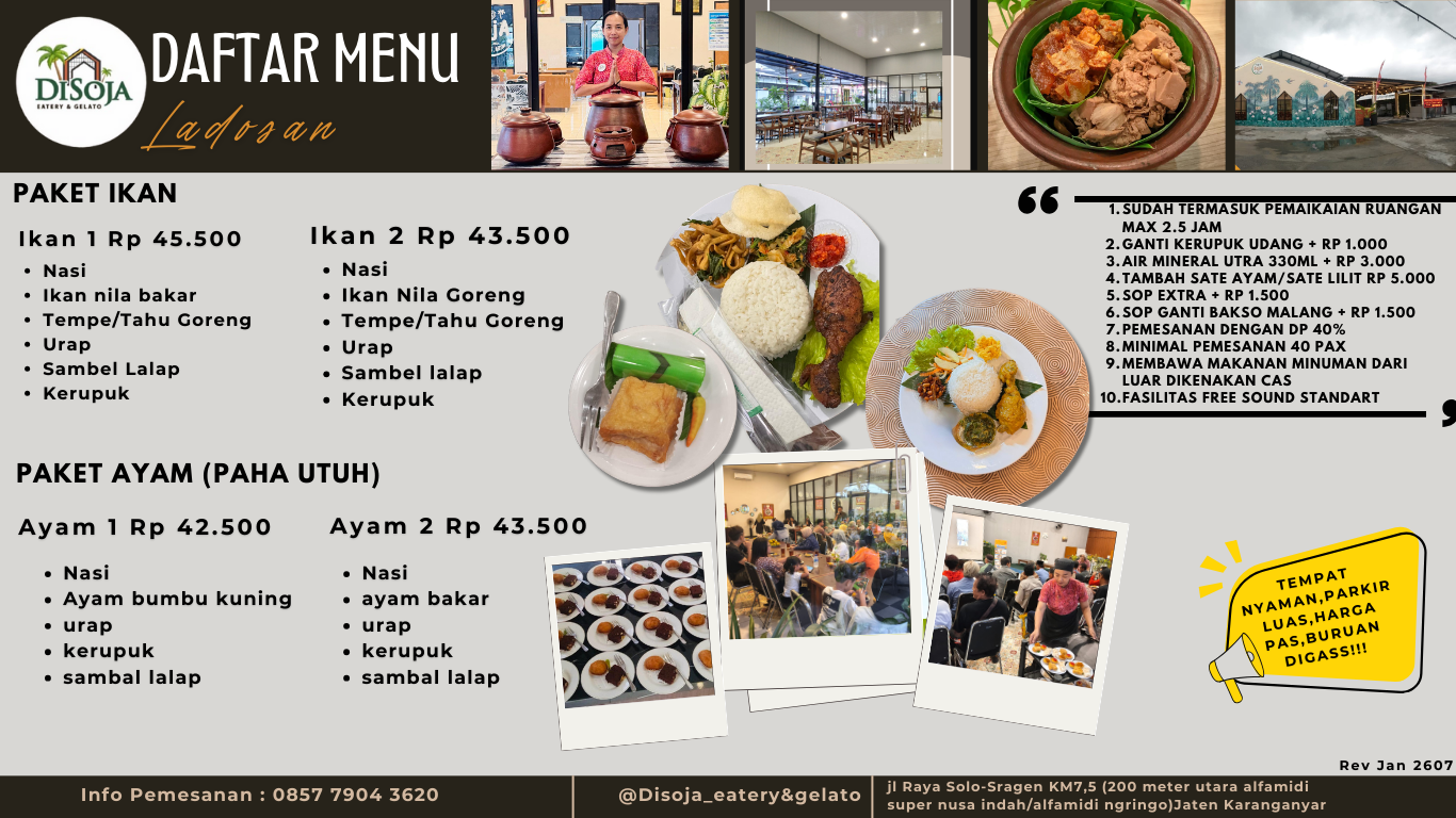 area makan cukup tertata dan bersih. Non smoking room dilengkapi dengan AC. menu makanan cita rasa masakan khas bumbu ala Solo Jogja. Rasa makanan cukup enak, harganya pun standar sesuai porsi. Ada parkiran yang lumayan luas bagi yang bawa mobil.
